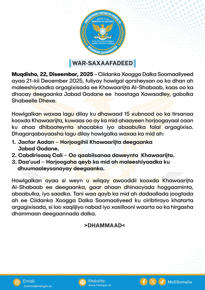 Isniin, December 22, 2025 (HOL) - Ciidanka Xoogga Dalka Soomaaliyeed (CXDS) ayaa 21-kii Diseembar 2025 fuliyay howlgal amni oo lagu beegsaday dagaalamayaal ka tirsan Al-Shabaab kuna sugnaa deegaanka Jabad Godane, oo hoos yimaada degmada Xawaadley ee gobolka Shabeellaha Dhexe.