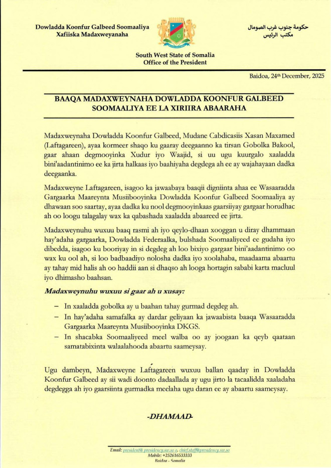 Arbaco, December 24, 2025 (HOL) - Madaxweynaha Dowlad Goboleedka Koonfur Galbeed Soomaaliya, Cabdicasiis Xasan Maxamed (Laftagareen), ayaa soo saaray baaq madaxweyne oo ku aaddan xaaladda abaareed ee ka jirta deegaanno ka mid ah Koonfur Galbeed, taas oo saameyn ba’an ku yeelatay nolosha shacabka, gaar ahaan reer guuraaga iyo beeraleyda.