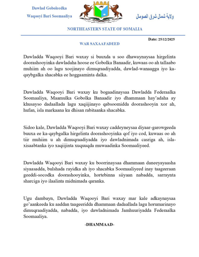 Khamiis, December 25, 2025 (HOL) - Maamulka Waqooyi Bari Soomaaliya ayaa si buuxda u soo dhawaysay hirgelinta doorashooyinka dowladaha hoose ee ka socda magaalada Muqdisho, kuwaas oo ay ku tilmaantay tallaabo muhiim ah oo xoojinaysa dimuqraadiyadda, dowlad-wanaagga iyo ka-qaybgalka shacabka ee hoggaaminta dalka.