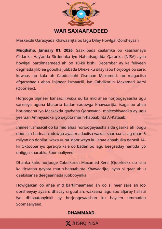 Jimco, January 2, 2026 (HOL) - Howlgal si gaar ah loo qorsheeyay oo ay si wadajir ah u fuliyeen Ciidanka Hay’adda Sirdoonka iyo Nabadsugidda Qaranka (NISA) iyo saaxiibada caalamka ayaa lagu dilay labo sarkaal oo sare oo ka tirsanaa Alshabaab, kaddib weerar bartilmaameed ah oo ka dhacay degmada Jilib ee gobolka Jubbada Dhexe.