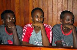 Somali nationals sit in the dock in a court in Kenya's coastal city of Mombasa, 480 km (298 miles) southeast of Nairobi October 26, 2006. Ten Somalis detained by the United States Navy off the coast of Somalia were found guilty of piracy by a Kenyan court on Thursday. REUTERS/Joseph Okanga (KENYA)