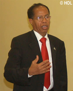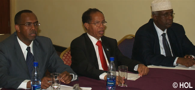 Nairobi, Kenya (HOL) - The Somalia Prime Minister Nuur Adde once again reiterated his earlier position stating that it is of paramount importance for the government and the opposition groups to reconcile if Somalia is to achieve a lasting peace.The Prime Minister is accompanied by the Miniter for Foreing Affairs Mr. Ali Jama Jangali, his Finance Minister Mr. Ali Hamud and the Somali Ambassador to Kenya Mr. Mohamed Ali Nur (America). The PM was addressing to the Somali intellectuals at the Panari Hotel in Nairobi.
