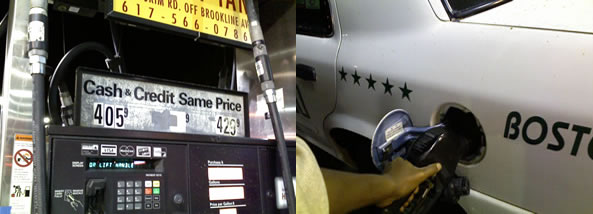 Mr. Abdullahi Jama fills up a half-tank for $49.12 after long 12 hours night shift at the Exxon Mobile Fenway. Gas price displays $4.05 per gallon