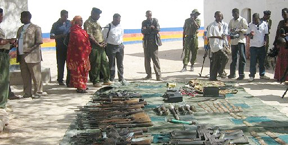 Victims of security operation in Mandela at the Elwak hospital and weapons seized from the warring clans on display. Police said more than 47 rifles and 900 rounds of ammunitions were recovered. PHOTO/FILE