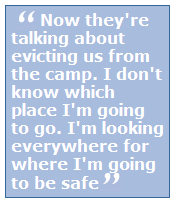She and her husband subsequently returned to Blue Waters Camp, where they have stayed despite the likelihood of imminent eviction. Her story was mirrored by many others who said they had attempted to return to their communities but were threatened or assaulted within a day or two, and had fled back to the camps.