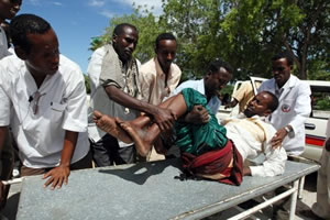 An injured man who was shot is brought to Medina Hospital in Mogadishu - Photo AFP |