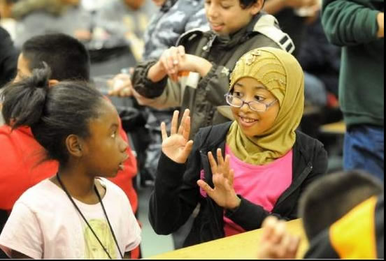 Somali fourth-grader Hana Abdi, right, talks with fellow fourth-grader Latavia Bates during lunch Friday at Eisenhower Elementary School in Green Bay. The number of Somali students enrolled in the Green Bay School District has increased from 18 to 90 since June. (H. Marc Larson/Press-Gazette)