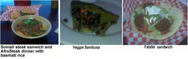 We began our meal with a large cup of the Somali chai tea, an incredibly sweet and aromatically spiced drink that could be described as a cross between Russian tea and regular chai. Other drink options include Ethiopian coffee and all of the other standard coffee shop fare: latte, mocha, cappuccino, etc.