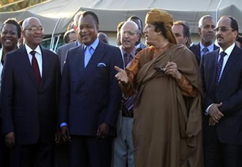 Libyan leader Muammar Gaddafi (2nd R) talks with Congo"s President Denis Sassou Nguessou (2nd L) as they stand for photograph with South Africa"s President Jacob Zuma (L) and Mauritania"s President Mohamed Ould Abdel Aziz outside a tent in Gaddafi"s heavily fortified Bab al-Aziziya compound in Tripoli, April 10, 2011.