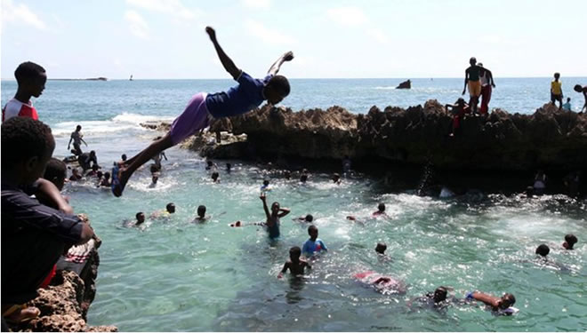 Residents play in the ocean in Mogadishu's Hamarweyne district. Feisal Omar/Reuters