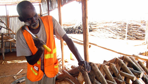 35-year-old Ali Mohammed Hussein fled his home in Bakool, Somalia about 15 months ago. Ali, his wife and six children escaped the fighting between the al-Shabaab militia and the Transitional Government Forces and embarked on the long and perilous journey to Ethiopia. Here, in Dolo Ado, they have been assisted with one of NRCs environmentally friendly shelters produced from local materials; and at the same time Ali has secured a livelihood through producing new shelter parts that will benefit other vulnerable families. His work consists of splitting bamboo into four sticks that will be used for walls. “It is hard work,” Ali explains while wiping the sweat off his forehead, “but thanks to NRC and this job I am able to provide for my family and send my children to school”.