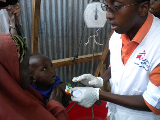 An MSF staff member measures a child's mid-upper arm circumferance to check for malnutrition in Mogadishu.