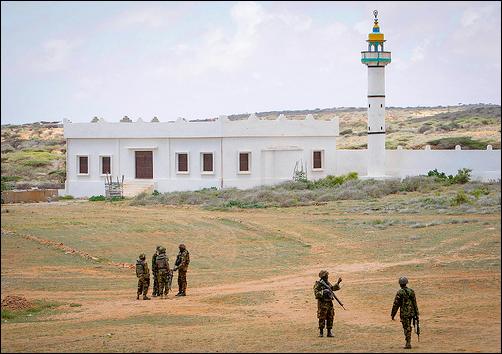 SOMALIA, Kismayo -- Soldiers serving with the Kenyan Contingent of the African Union Mission in Somalia (AMISOM) stand infront of a mosque in the grounds of Kismayo University in the southern Somali port city of Kismayo, approx. 500km south of the country’s capital Mogadishu. AU-UN IST PHOTO / STUART PRICE