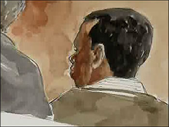 ![]() A sketch of Mohamed Mohamud in court at the beginning of his trial. (Sketch by Deborah Marble) |