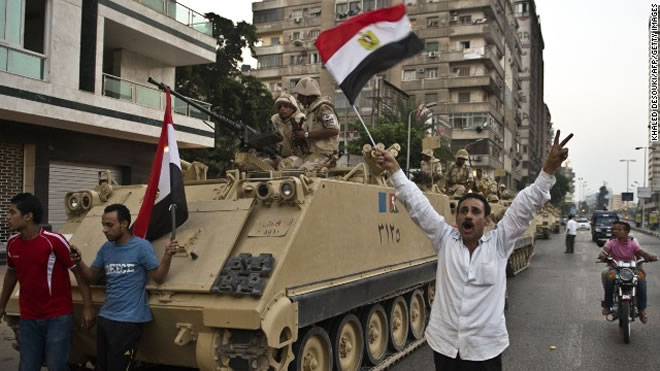 Egyptians salute Army tanks upon their deployment on a street leading to Cairo University on Wednesday July 3. On Monday, the Egyptian military gave Morsy a 48-hour ultimatum to accommodate his opponents with a power-sharing agreement or be pushed aside.