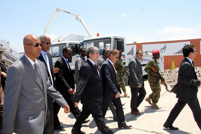 Mogadishu - The Prime Minister of the Federal Government of Somalia His Excellency Abdiweli Sheikh Ahmed, accompanied by the Minister of Air and Land Transport and his deputy, the Minister of Finance, the Turkish Ambassador and the General Manager of Aden Adde International Airport, laid the foundation stone for the building of the Aviation Training Academy at Aden Adde International Airport.