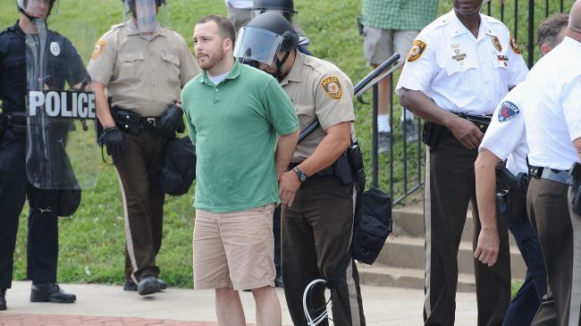 A man is arrested during a protest against the shooting death of 18-year-old Michael Brown outside Ferguson Police Department Headquarters in Ferguson, Missouri, August 11, 2014.