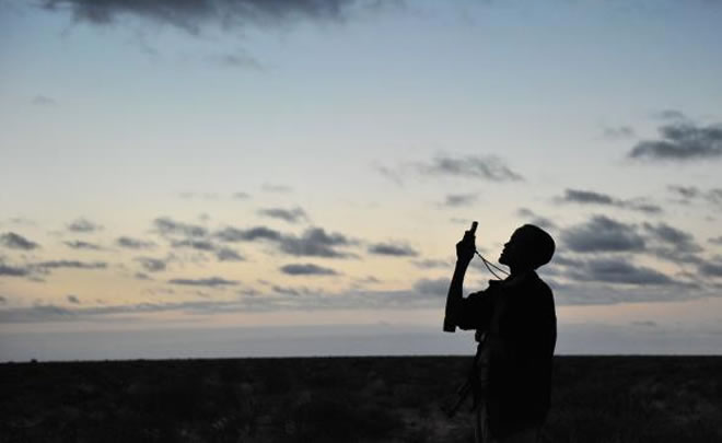 A militiaman in central Somaliasearches for a network signal.