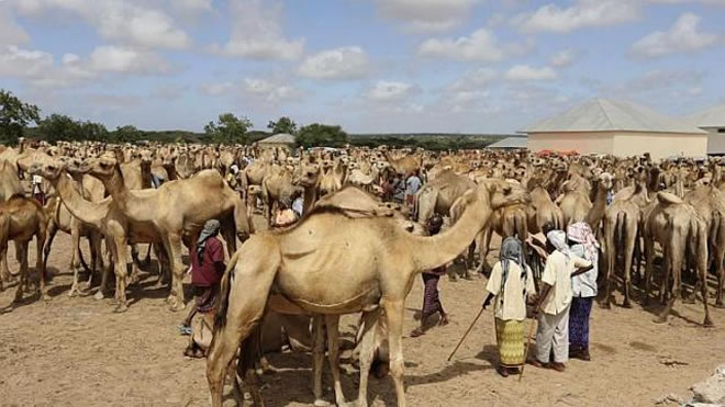 Somali traders and their camels wait at the open air export market, on the outskirts of Somalia's capital Mogadishu in this June 7, 2014, file photo. -- PHOTO: REUTERS