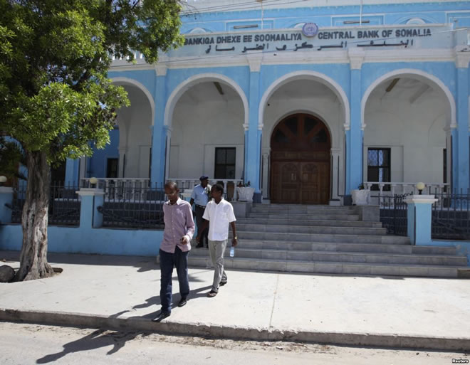 People walk outside Somalia's central Bank in Hamarwayne district, south of capital Mogadishu