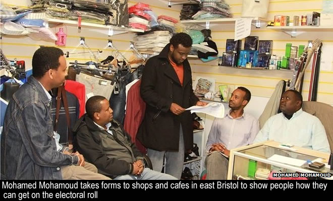 British Somali Mohamed Mohamoud is a man on a mission for democracy. He wants to get as many people as possible in Bristol's Somali community registered to vote in the European elections.
