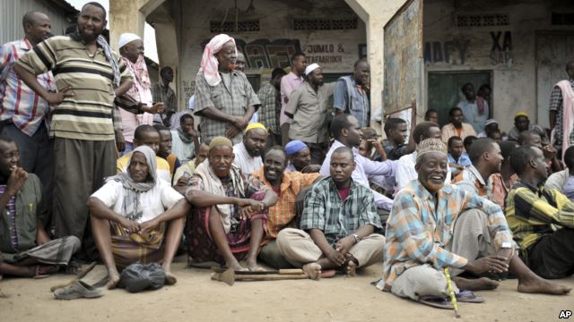 People in the Somali town of Bulomarer wait to speak with a leader after government troops help drive off al-Shabab militants Aug. 31, 2014.