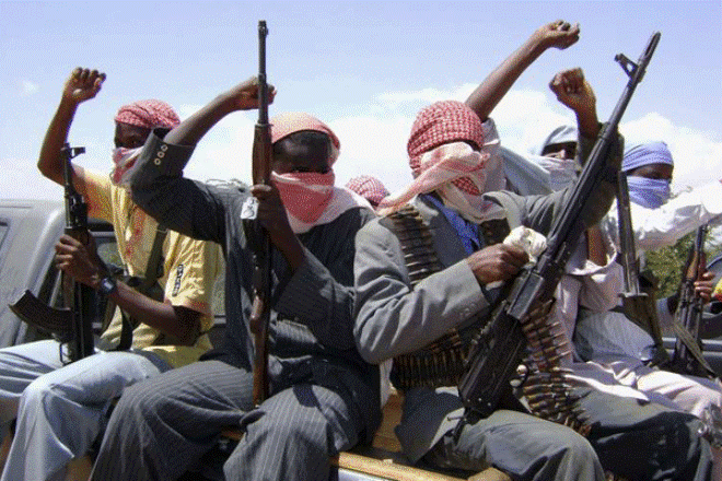 Somali Islamist militants hold their weapons as they ride on a pick-up truck on the outskirts of the Somali capital Mogadishu on February 2, 2009. Reports from Lower Juba region in Southern Somalia indicate that militants loyal to Islamic State (IS) militants seized a village on Wednesday. PHOTO | MOWLID ABDI | REUTERS
