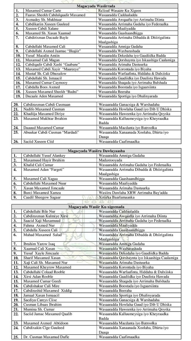 Among the returning former Ministers who keep their formers posts are the Ministers of Defence, Finance, Foreign Affairs, Justice and Women’s and Human Rights Affairs. Among the women in the new Cabinet are Khadija Mohamed Deriye who keeps her former post as the Minister for Women and Human Rights and Nadifo Mohamed Osman who also remains at the Ministry of Planning.