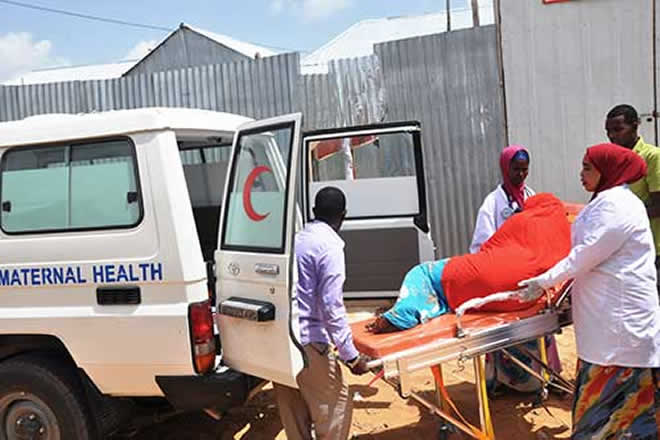 A pregnant woman experiencing labour complications is transferred to a hospital from a maternity waiting home. © UNFPA Somalia/Ruth Solomon