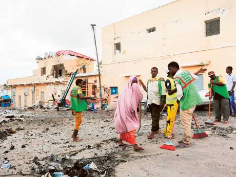 Workers clear debris at the scene of an explosion at the gate of the Siyaad hotel after Friday night’s attack by Al Shabab militants in Mogadishu.
