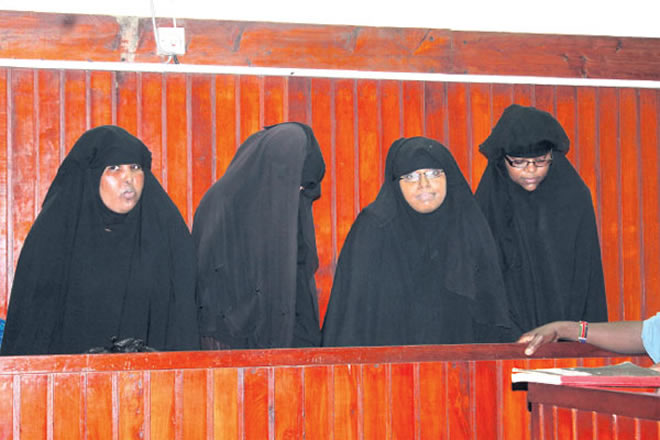 From left, Ms Halima Adan Ali, Ms Maryam Said Aboud, Ms Khadija Abubakar Abdulkadir and Ms Ummulkheir Sadir Abdalla at the Mombasa Law Courts, where they were on May 6, 2015 charged with being members of a terrorist group. They denied the charges. PHOTO | WACHIRA MWANGI | NATION MEDIA GROUP