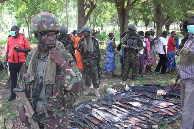 KDF soldiers display a cache of weapons outside Mpeketoni Hospital after killing 11 Al-Shabaab terrorists who had attacked a military camp in Lamu. PHOTO | ATHMAN OMAR | NATION MEDIA GROUP