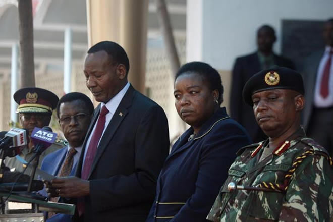 From right: Deputy Inspector-General of Police Samuel Arachi, Interior Principal Secretary Monica Juma, Interior Cabinet Secretary Joseph Nkaissery, National Police Service Commission chairman Johnston Kavuludi and Inspector-General of Police Joseph Boinnet outside Harambee House on April 21, 2015. PHOTO | EVANS HABIL | NATION MEDIA GROUP