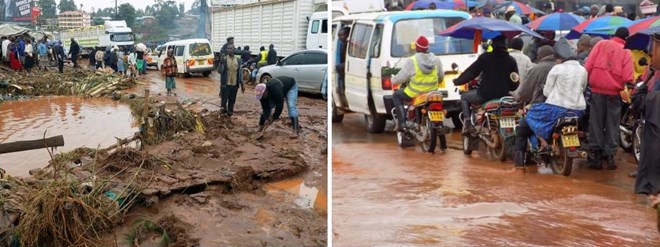 Local residents and motorists wade through a flooded area at Darajambili market in Kisii county. Parts of Kisii town were rendered inaccessible in the aftermath of heavy rains witnessed in the area on Thursday. Traders at the market lost goods worth thousands of shillings. PHOTO - SIMBI KUSIMBA
