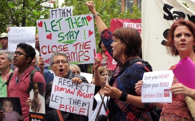 People hold up placards at a protest outside an immigration office in Sydney on 4 February.