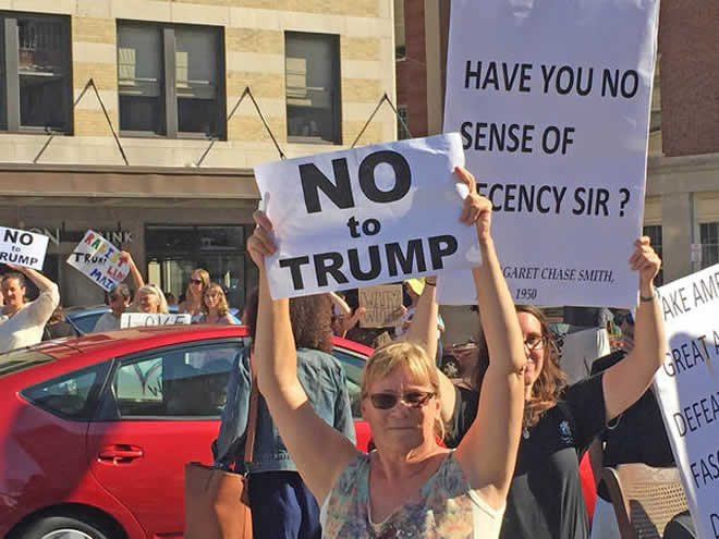 “Hillary Clinton wants to have them come in by the hundreds of thousands,” Trump said to boos from his raucous capacity crowd of 1,600 at Portland’s Merrill Auditorium. “This has nothing to do with politics, folks. This is a whole different level. This has to do with pure, raw stupidity.”