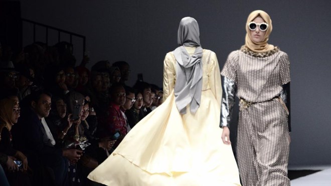 Models present creations by Indonesian Muslim designer Anniesa Hasibuan during Jakarta Fashion Week, in Jakarta, on October 28, 2016. (AFP)