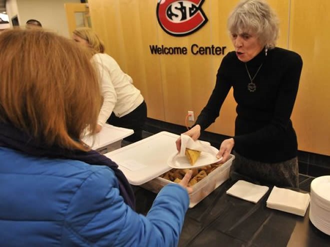 Bette Bartos hands out a sambusa during #UniteCloud's Sambusa Sunday. The event served as an opportunity to promote dialogue in the St. Cloud community. (Photo: Ben Rodgers, [email protected])