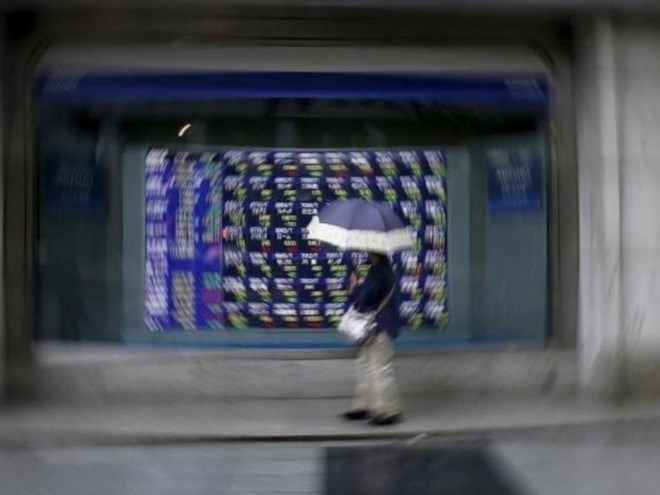A woman holding an umbrella looks at an electronic stock quotation board outside a brokerage in Tokyo September 8, 2015./REUTERS