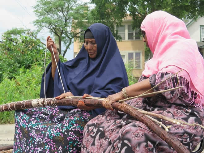 Her interpreter, Amine Muse, who is also the education coordinator for the Somali Museum of Minnesota, explained that once the hut's skeleton is made, the women work on the inside, weaving traditional mats.
