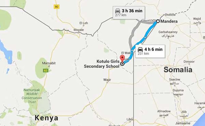 Five police officers escorting a passenger bus from Mandera were killed Monday morning after their vehicle was hit by a rocket-propelled grenade near Kotulo. GOOGLE MAPS