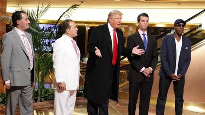 Farouk Shami, in white, with Donald Trump, centre,) on the TV show Celebrity Apprentice [Photo courtesy of Farouk Shami]