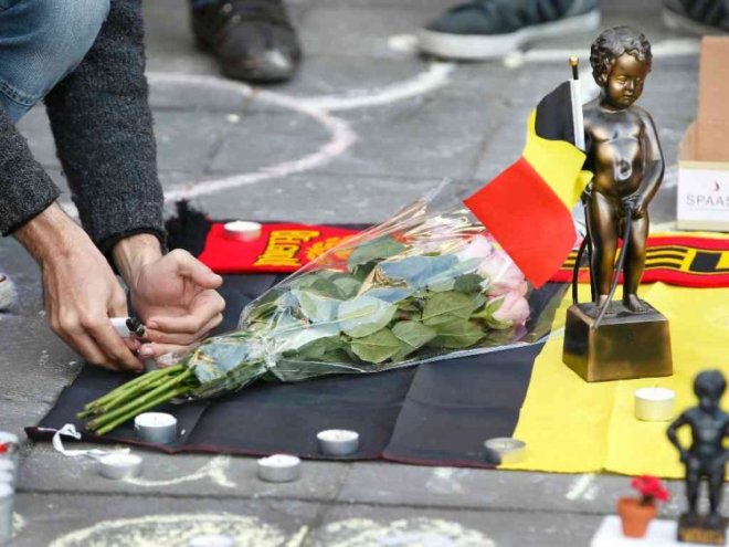 People gather around a memorial featuring a Menneken-Pis statue in Brussels following bomb attacks s in Brussels, Belgium, March 22, 2016. REUTERS/Charles Platiau