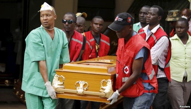 FILE - Mortuary workers and Kenya Red Cross volunteers carry the coffin containing the body of Mildred Yondo, a student killed during an attack by gunmen at Garissa University, from the Chiromo Mortuary in the capital Nairobi, April 8, 2015.