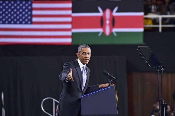 US President Barack Obama gestures during a speech at the Moi International Sports Centre, in Nairobi on July 26, 2015. There’s little enthusiasm for Obama in Africa as he prepares to hand over to either Hillary Clinton or Donald Trump/ FILE PHOTO | AFP