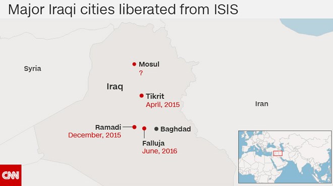 For ISIS, the capture of Mosul formed a vital part of its self-declared caliphate across swaths of Iraq and Syria, in addition to assaults on Ramadi, Tikrit and Falluja. One by one, in the past two years, coalition forces have reclaimed those cities.
