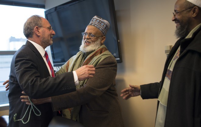 Imam Sheikh Sa’ad Musse Roble, with the World Peace Organization, greeted U.S. Attorney Andrew Luger alongside Imam Ahmed Burale before a community meeting in 2015. Luger is leading a Muslim outreach initiative in hopes of thwarting terrorist groups from recruiting vulnerable, homegrown kids, and he has advocated for funding.  Aaron Lavinsky; Star Tribune