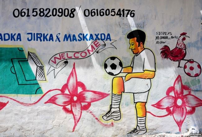 A mural depicting a soccer player is seen on a wall of a stadium in Hodan district of Mogadishu, Somalia, June 13, 2017.