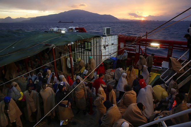 Migrants sleep on the deck of the rescue ship Vos Hestia, operated by Save the Children, as it heads for Sicily. The migrants, of several nationalities, were bound for Europe.