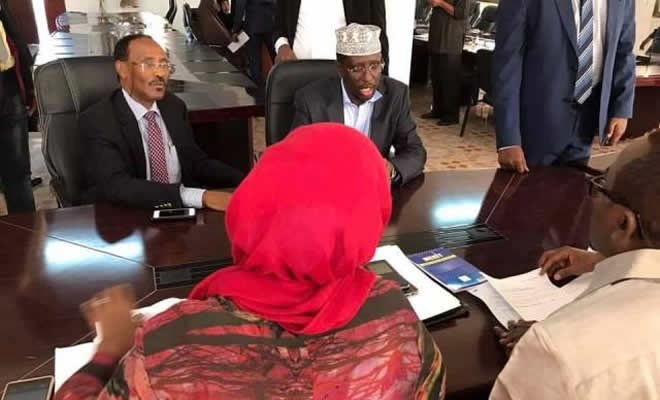 Presidential candidate Sheikh Sharif Sheikh Ahmed completing his registration with Abdirahman Duale Beyle, the head of the Presidential Electoral Commission